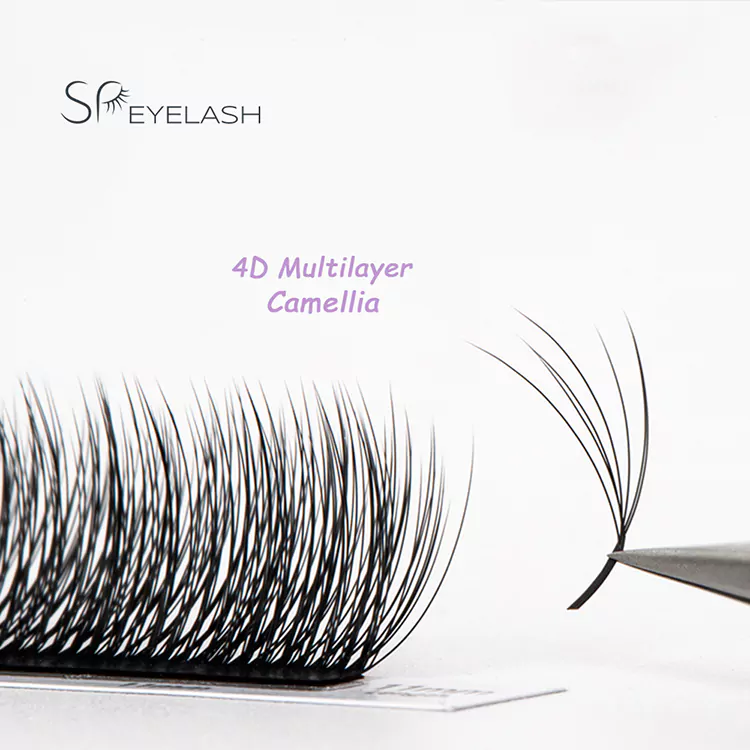 Innovative mehrschichtige Strukturdesign von Kamelienblumen, die ein flauschiges und wildes Gefühl durch gestaffelte geschichtete Formen erzeugen, wodurch die Augen dynamischer und charmanter werden