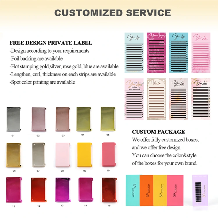 SP Eyelash bietet eine breite Palette von Anpassungsoptionen für V-förmige Wimpernböcke, einschließlich proprietärer Marken und Verpackungen, geringer Mindestauftragsmenge und kostenloser Entwurfsunterstützung. Bevor Sie eine Massenbestellung aufgeben, testen Sie die Qualität mithilfe kostenloser Proben sicher.